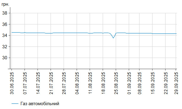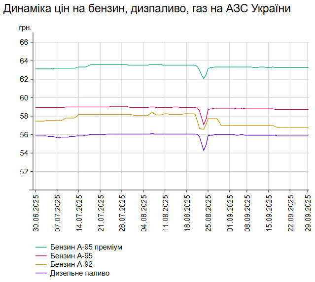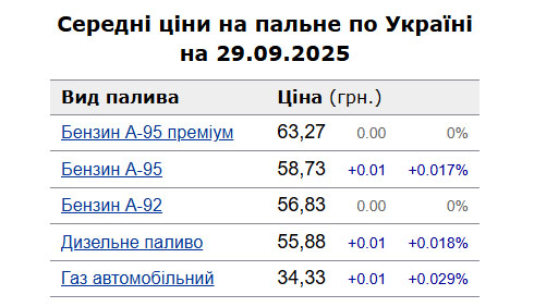 Зокрема, зафіксовано такі середні ціни на пальне: бензин марки А-95 (преміум) - 63,27 грн/л; бензин марки А-95 - 58,73 грн/л (здорожчав на 1 коп.); бензин марки А-92 - 55,83 грн/л; дизельне пальне - 55,88 грн/л (здорожчало на 1 коп.). Середня ціна автогазу становить 34,33 грн/л, що на 1 коп. більше порівняно із попереднім робочим днем - 26 вересня.