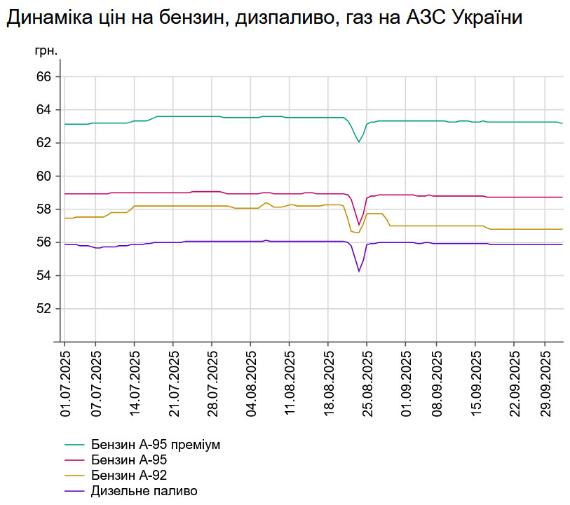 Зокрема, зафіксовано такі середні ціни на пальне: бензин марки А-95 (преміум) - 63,22 грн/л (здешевшав на 3 коп.); бензин марки А-95 - 58,73 грн/л (здорожчав на 2 коп.); бензин марки А-92 - 55,8 грн/л (здорожчав на 3 коп.); дизельне пальне - 55,88 грн/л (здорожчало на 2 коп.). Середня ціна автогазу становить 34,31 грн/л, що відповідає рівню попереднього дня.