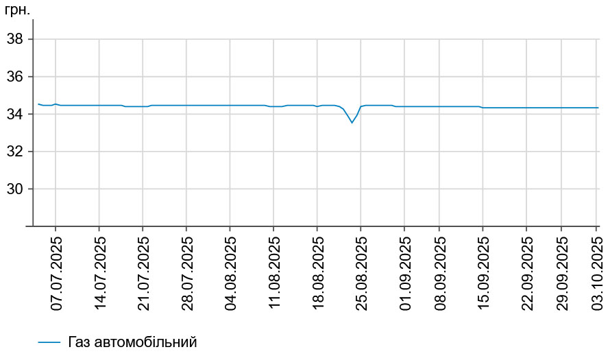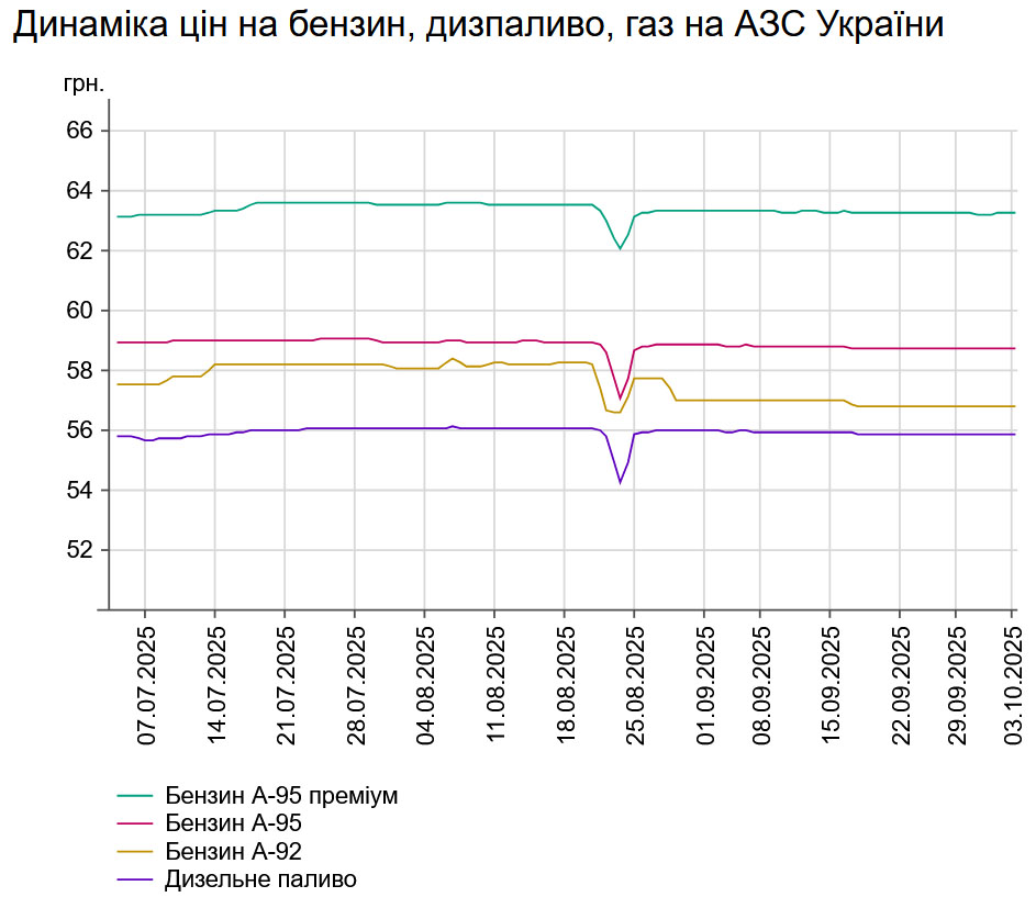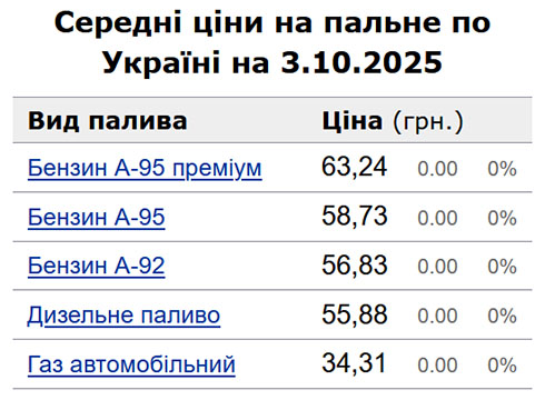 Зокрема, зафіксовано такі середні ціни на пальне: бензин марки А-95 (преміум) - 63,24 грн/л; бензин марки А-95 - 58,73 грн/л; бензин марки А-92 - 55,83 грн/л; дизельне пальне - 55,88 грн/л. Середня ціна автогазу становить 34,31 грн/л, що відповідає рівню попереднього дня.