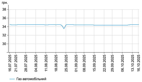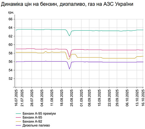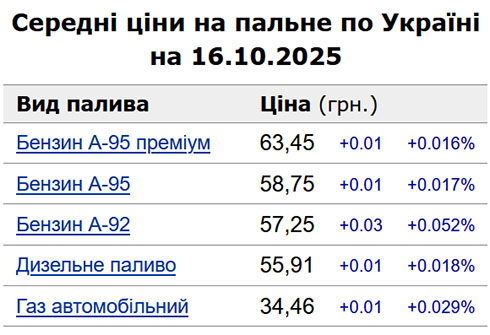 Зокрема, зафіксовано такі середні ціни на пальне: бензин марки А-95 (преміум) - 63,45 грн/л (здорожчав на 1 коп.); бензин марки А-95 - 58,75 грн/л (здорожчав на 1 коп.); бензин марки А-92 - 57,25 грн/л (здорожчав на 3 коп.); дизельне пальне - 55,91 грн/л (здорожчало на 1 коп.). Середня ціна автогазу становить 34,46 грн/л, що на 1 коп. більше порівняно із попереднім днем.