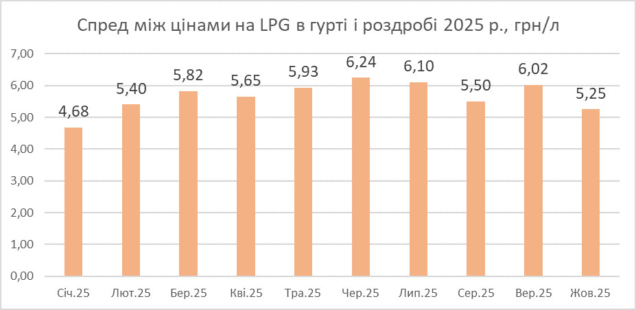 Порівняно з середнім показником минулого року (4,52 грн/л) різниця між гуртом і роздробом у жовтні залишається досить непоганою. Але слід зазначити, що 2025 року витрати у мереж на утримання заправного комплексу зросли. Також у грудні 2024-го з'явився авансовий платіж з податку на прибуток, який свого часу невеликі оператори оцінювали у середньому як 0,80 грн/л додатково до собівартості пального.
