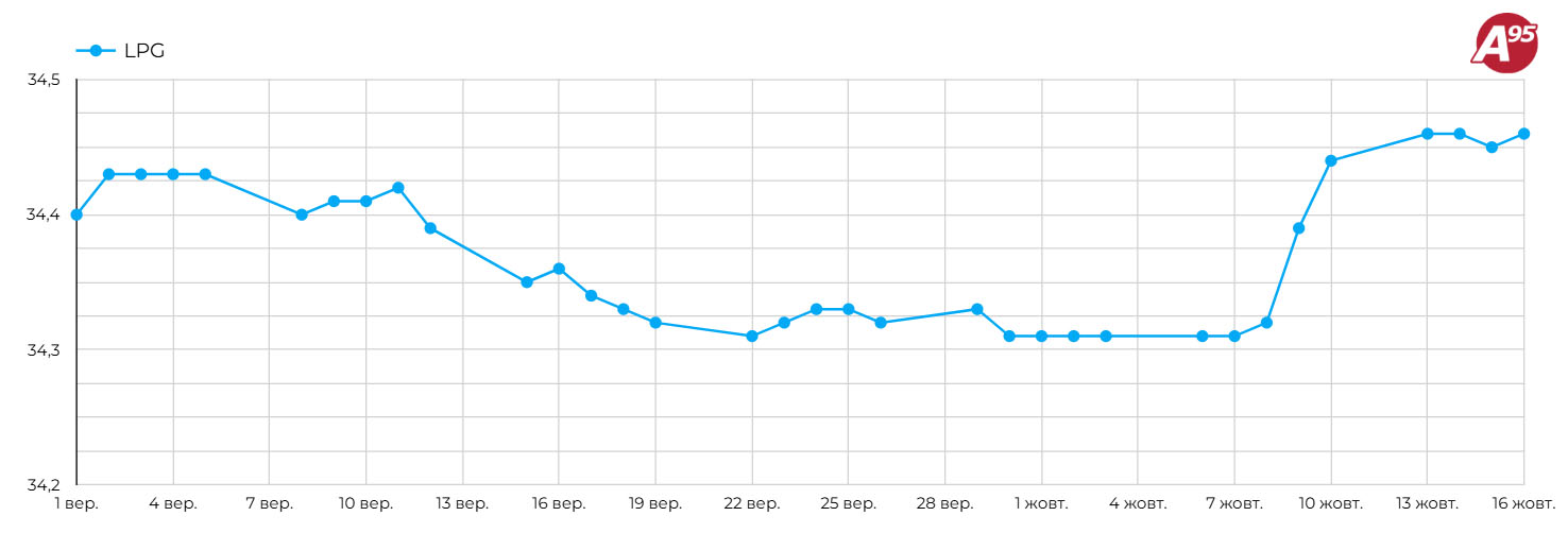 З початку жовтня середня вартість скрапленого газу на колонках зросла на 14 коп./л, до 34,46 грн/л, про що свідчить моніторинг Консалтингової групи «А-95».