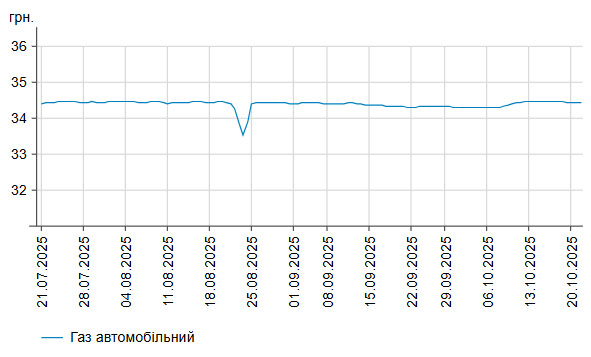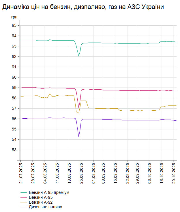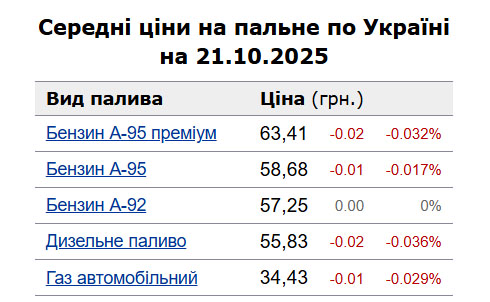 Зокрема, зафіксовано такі середні ціни на пальне: бензин марки А-95 (преміум) - 63,41 грн/л (здешевшав на 2 коп.); бензин марки А-95 - 58,68 грн/л (здешевшав на 1 коп.); бензин марки А-92 - 57,25 грн/л; дизельне пальне - 55,83 грн/л (здешевшало на 2 коп.). Середня ціна автогазу становить 34,43 грн/л, що на 1 коп. менше порівняно із попереднім днем.