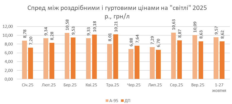 Водночас у середньому за жовтень «дизельний» спред становив 8,62 грн/л, що майже дорівнює показникові вересня, на бензині - 9,57 грн/л (-0,50 грн/л до показників минулого місяця).