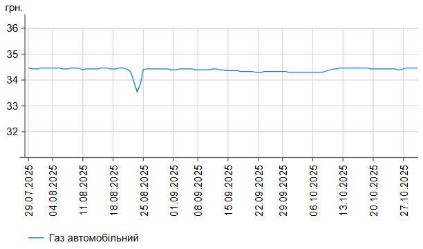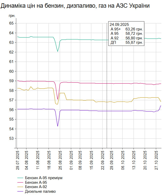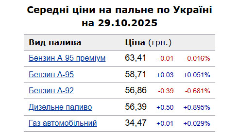 Зокрема, зафіксовано такі середні ціни на пальне: бензин марки А-95 (преміум) - 63,41 грн/л (здешевшав на 1 коп.); бензин марки А-95 - 58,71 грн/л (здорожчав на 3 коп.); бензин марки А-92 - 57,25 грн/л; дизельне пальне - 56,39 грн/л (здорожчало на 50 коп.). Середня ціна автогазу становить 34,47 грн/л, що на 1 коп. більше порівняно із попереднім днем.
