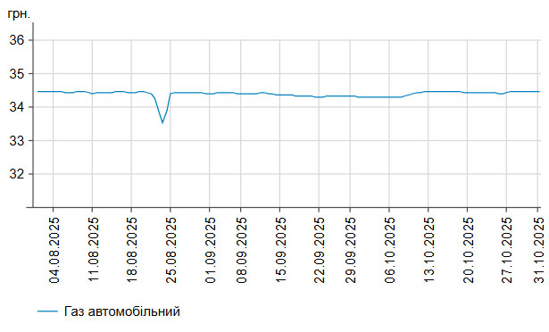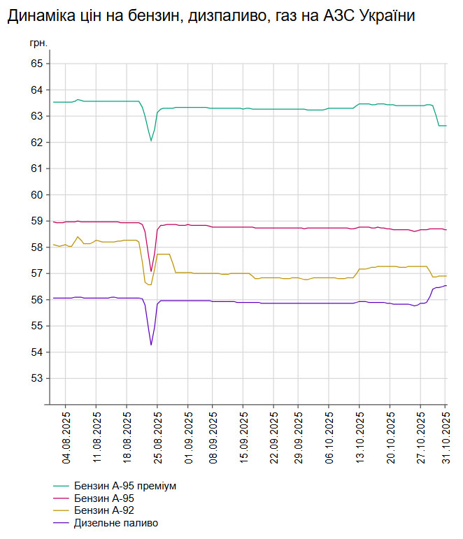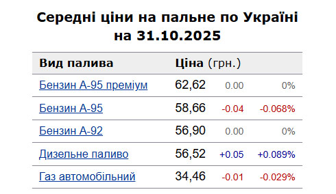 Зокрема, зафіксовано такі середні ціни на пальне: бензин марки А-95 (преміум) - 62,62 грн/л; бензин марки А-95 - 58,66 грн/л (здешевшав на 4 коп.); бензин марки А-92 - 56,9 грн/л; дизельне пальне - 56,52 грн/л (здорожчало на 5 коп.). Середня ціна автогазу становить 34,46 грн/л, що на 1 коп. менше порівняно із попереднім днем.