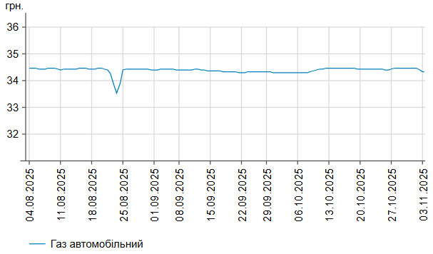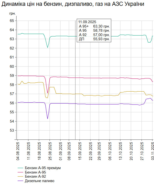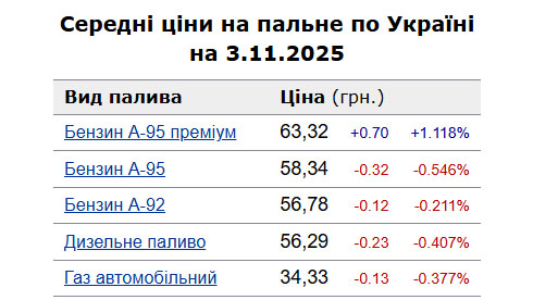 Зокрема, зафіксовано такі середні ціни на пальне: бензин марки А-95 (преміум) - 63,32 грн/л (здорожчав на 70 коп.); бензин марки А-95 - 58,34 грн/л (здешевшав на 32 коп.); бензин марки А-92 - 56,78 грн/л (здешевшав на 12 коп.); дизельне пальне - 56,29 грн/л (здешевшало на 23 коп.). Середня ціна автогазу становить 34,33 грн/л, що на 13 коп. менше порівняно із попереднім робочим днем - 31 жовтня.
