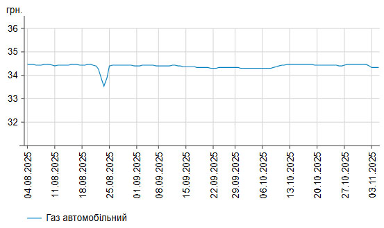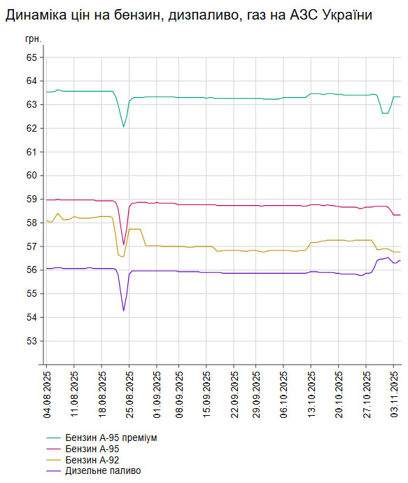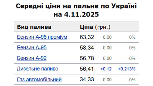 Зокрема, зафіксовано такі середні ціни на пальне: бензин марки А-95 (преміум) - 63,32 грн/л; бензин марки А-95 - 58,34 грн/л; бензин марки А-92 - 56,78 грн/л; дизельне пальне - 56,41 грн/л (здорожчало на 12 коп.). Середня ціна автогазу становить 34,33 грн/л - на рівні попереднього дня.