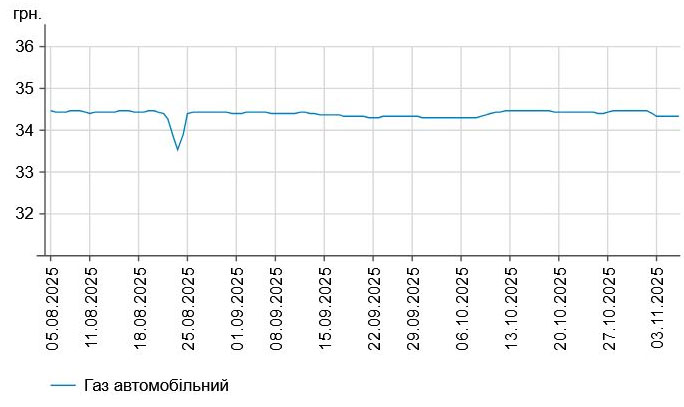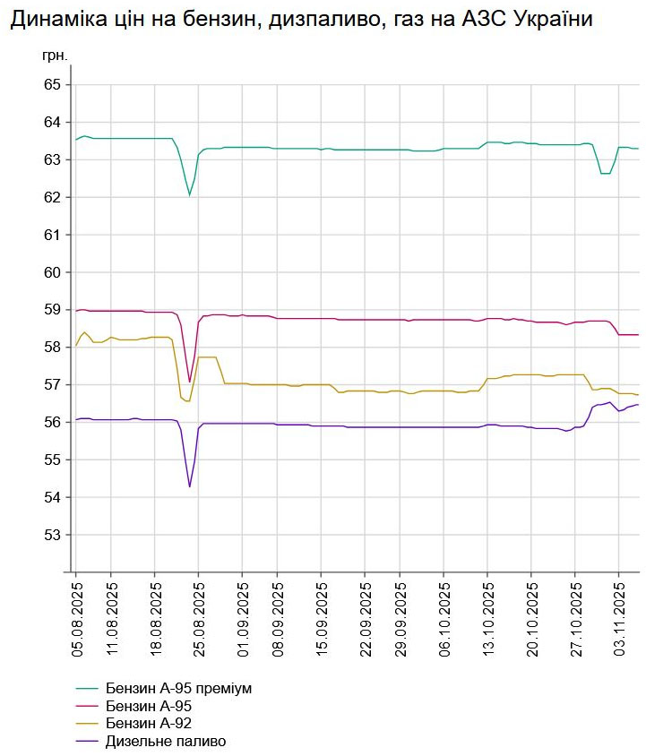Зокрема, зафіксовано такі середні ціни на пальне: бензин марки А-95 (преміум) - 63,31 грн/л (здешевшало на 1 коп.); бензин марки А-95 - 58,33 грн/л (здешевшало на 1 коп.); бензин марки А-92 - 56,72 грн/л (здешевшало на 6 коп.); дизельне пальне - 56,46 грн/л (здорожчало на 5 коп.). Середня ціна автогазу становить 34,34 грн/л, що на 1 коп. дорожче порівняно із попереднім днем.