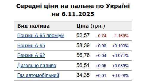 Зокрема, зафіксовано такі середні ціни на пальне: бензин марки А-95 (преміум) - 62,57 грн/л (здешевшав на 74 коп.); бензин марки А-95 - 58,39 грн/л (здорожчав на 6 коп.); бензин марки А-92 - 56,76 грн/л (здорожчав на 4 коп.); дизельне пальне - 56,51 грн/л (здорожчало на 5 коп.). Середня ціна автогазу становить 34,35 грн/л, що на 1 коп. дорожче порівняно із попереднім днем.