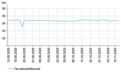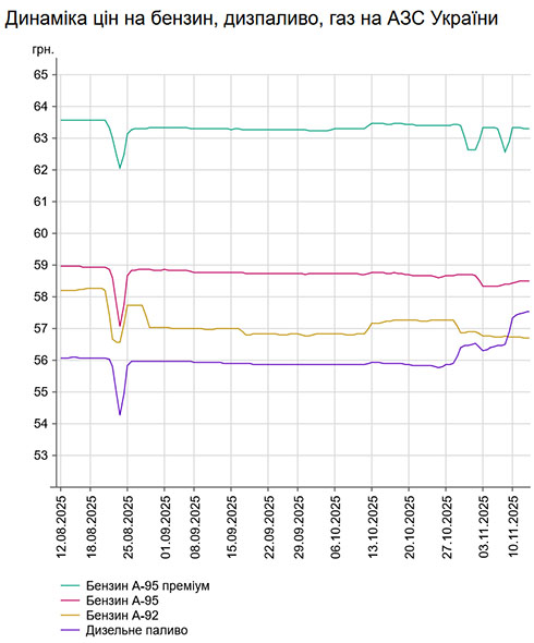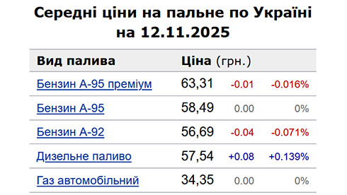Зокрема, зафіксовано такі середні ціни на пальне: бензин марки А-95 (преміум) - 63,31 грн/л (здешевшав на 1 коп.); бензин марки А-95 - 58,49 грн/л; бензин марки А-92 - 56,69 грн/л (здешевшав на 4 коп.); дизельне пальне - 57,54 грн/л (здорожчало на 8 коп.). Середня ціна автогазу становить 34,35 грн/л - на рівні попереднього дня.
