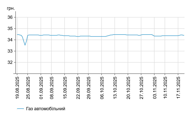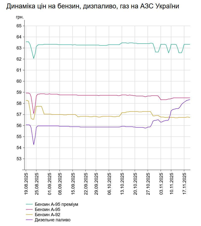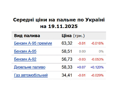 Зокрема, зафіксовано такі середні ціни на пальне: бензин марки А-95 (преміум) - 63,32 грн/л (здешевшав на 1 коп.); бензин марки А-95 - 58,51 грн/л; бензин марки А-92 - 56,76 грн/л (здешевшав на 3 коп.); дизельне пальне - 58,33 грн/л (здорожчало на 7 коп.). Середня ціна автогазу становить 34,41 грн/л - на 1 коп. менше, ніж попереднього дня