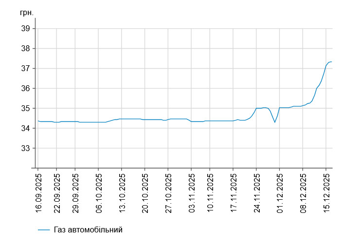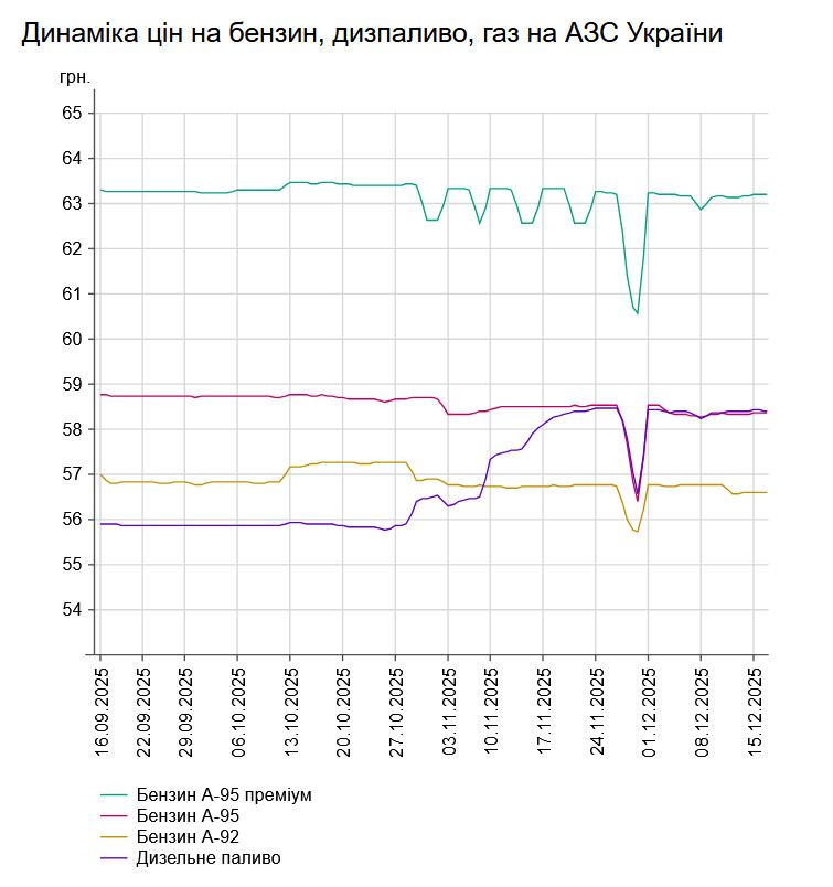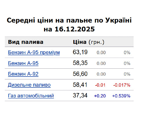 Зокрема, зафіксовано такі середні ціни на пальне: бензин марки А-95 (преміум) - 63,19 грн/л; бензин марки А-95 - 58,35 грн/л; бензин марки А-92 - 56,6 грн/л; дизельне пальне - 58,41 грн/л (здешевшало на 1 коп.). Середня ціна автогазу становить 37,34 грн/л, що на 20 коп. більше порівняно з минулим днем.