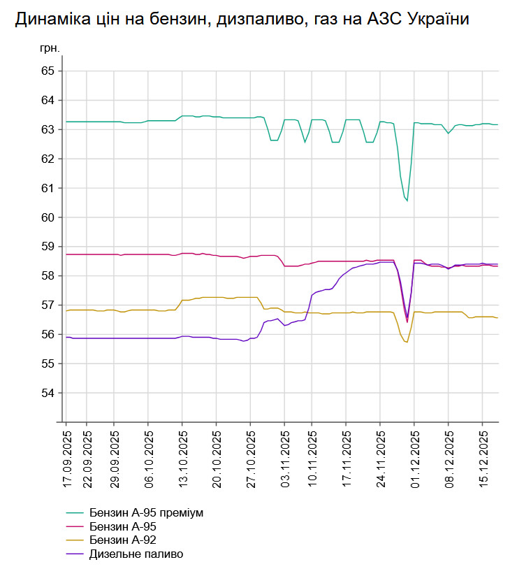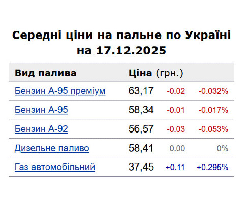 Зокрема, зафіксовано такі середні ціни на пальне: бензин марки А-95 (преміум) - 63,17 грн/л (здешевшав на 2 коп.); бензин марки А-95 - 58,34 грн/л (здешевшав на 1 коп.); бензин марки А-92 - 56,57 грн/л (здешевшав на 3 коп.); дизельне пальне - 58,41 грн/л. Середня ціна автогазу становить 37,45 грн/л, що на 11 коп. більше порівняно з минулим днем.