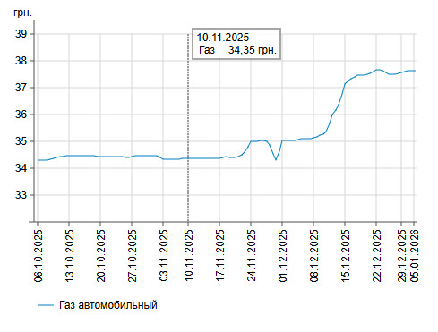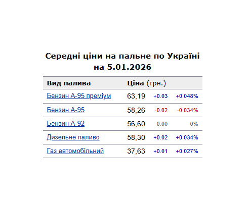 Зокрема, зафіксовано такі середні ціни на пальне: бензин марки А-95 (преміум) - 63,19 грн/л (здорожчав на 3 коп.); бензин марки А-95 - 58,26 грн/л (здешевшав на 2 коп.); бензин марки А-92 - 56,6 грн/л; дизельне пальне - 58,3 грн/л (здорожчало на 2 коп.). Середня ціна автогазу становить 37,63 грн/л, що на 1 коп. більше порівняно із ціною на 30 грудня.