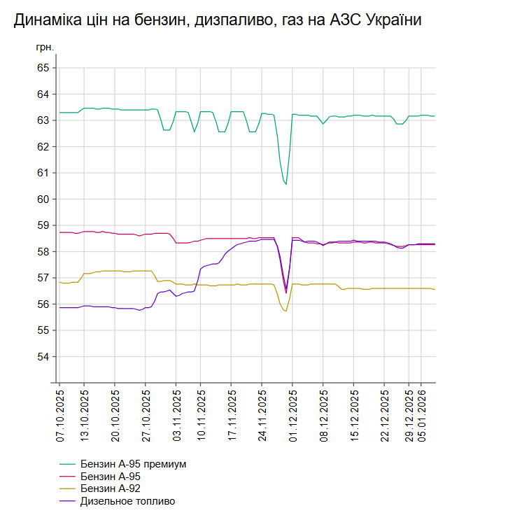 Зокрема, зафіксовано такі середні ціни на пальне: бензин марки А-95 (преміум) - 63,17 грн/л (здешевшав на 2 коп.); бензин марки А-95 - 58,25 грн/л; бензин марки А-92 - 56,57 грн/л (здешевшав на 3 коп.); дизельне пальне - 58,31 грн/л (здорожчало на 1 коп.). Середня ціна автогазу становить 37,94 грн/л, що на 4 коп. більше порівняно з попереднім днем.