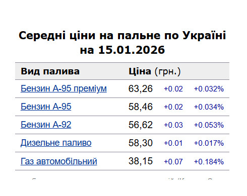Зокрема, зафіксовано такі середні ціни на пальне: бензин марки А-95 (преміум) - 63,26 грн/л (здорожчав на 2 коп.); бензин марки А-95 - 58,46 грн/л (здорожчав на 2 коп.); бензин марки А-92 - 56,62 грн/л (здорожчав на 3 коп.); дизельне пальне - 58,3 грн/л (здорожчало на 1 коп.). Середня ціна автогазу становить 38,15 грн/л, що на 7 коп. дорожче порівняно із попереднім днем.