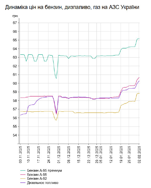Зокрема, зафіксовано такі середні ціни на пальне: бензин марки А-95 (преміум) - 65,16 грн/л (здорожчав на 10 коп.); бензин марки А-95 - 60,65 грн/л (здорожчав на 28 коп.); бензин марки А-92 - 58,82 грн/л (здорожчав на 7 коп.); дизельне пальне - 60,26 грн/л (здорожчало на 33 коп.). Середня ціна автогазу становить 38,34 грн/л, що на 1 коп. дорожче порівняно із попереднім днем.