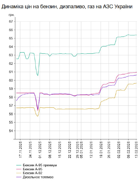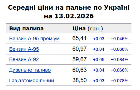 Зокрема, зафіксовано такі середні ціни на пальне: бензин марки А-95 (преміум) - 65,41 грн/л (здорожчав на 3 коп.); бензин марки А-95 - 60,97 грн/л (здорожчав на 4 коп.); бензин марки А-92 - 59,67 грн/л (здорожчав на 5 коп.); дизельне пальне - 60,63 грн/л (здорожчало на 4 коп.). Середня ціна автогазу становить 38,5 грн/л, що на 3 коп. дорожче порівняно із попереднім днем.