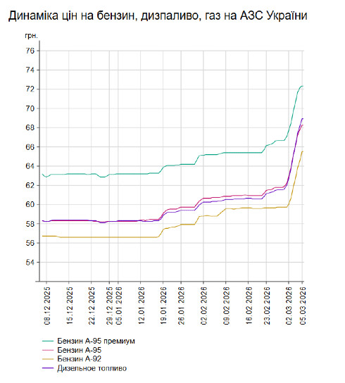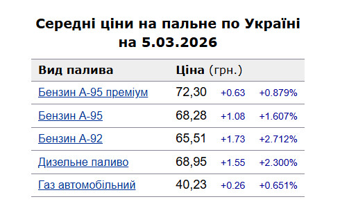 Зокрема, зафіксовано такі середні ціни на пальне: бензин марки А-95 (преміум) - 72,3 грн/л (здорожчав на 63 коп.); бензин марки А-95 - 68,28 грн/л (здорожчав на 1,08 грн); бензин марки А-92 - 65,51 грн/л (здорожчав на 1,73 грн); дизельне пальне - 68,95 грн/л (здорожчало на 1,55 грн). Середня ціна автогазу становить 40,23 грн/л, що на 26 коп. дорожче порівняно із попереднім днем.