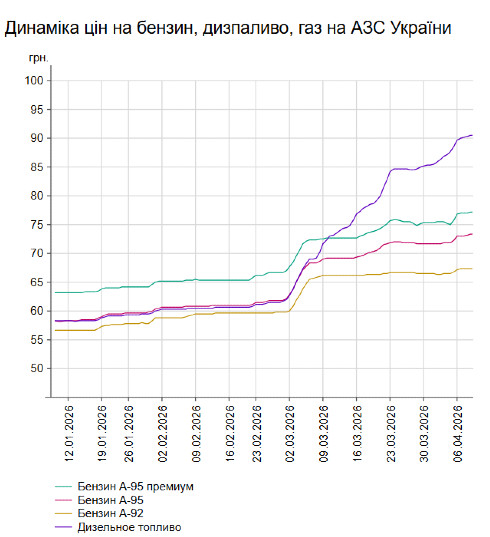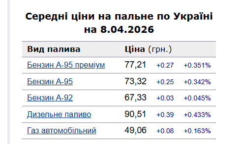 Зокрема, зафіксовано такі середні ціни на пальне: бензин марки А-95 (преміум) - 77,21 грн/л (здорожчав на 27 коп.); бензин марки А-95 - 73,32 грн/л (здорожчав на 25 коп.); бензин марки А-92 - 67,33 грн/л (здорожчав на 3 коп.), дизпальне - 90,51 грн/л (здорожчало на 39 коп.). Середня ціна автогазу становить 49,06 грн/л, що на 8 коп. дорожче порівняно з попереднім днем.