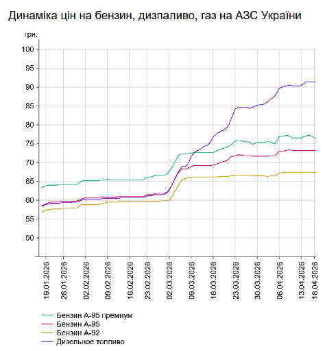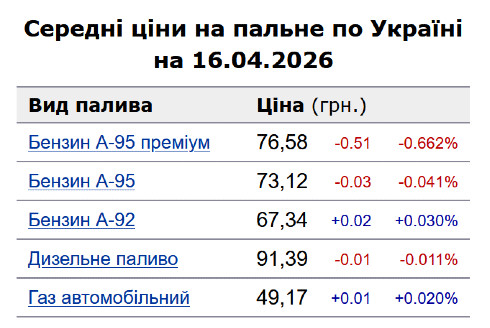 Зокрема, зафіксовано такі середні ціни на пальне: бензин марки А-95 (преміум) - 76,58 грн/л (здешевшав на 51 коп.); бензин марки А-95 - 73,12 грн/л (здешевшав на 3 коп.); бензин марки А-92 - 67,34 грн/л (здорожчав на 2 коп.); дизпальне - 91,39 грн/л (здешевшало на 1 коп.). Середня ціна автогазу становить 49,17 грн/л, що на 1 коп. більше порівняно з попереднім днем.
