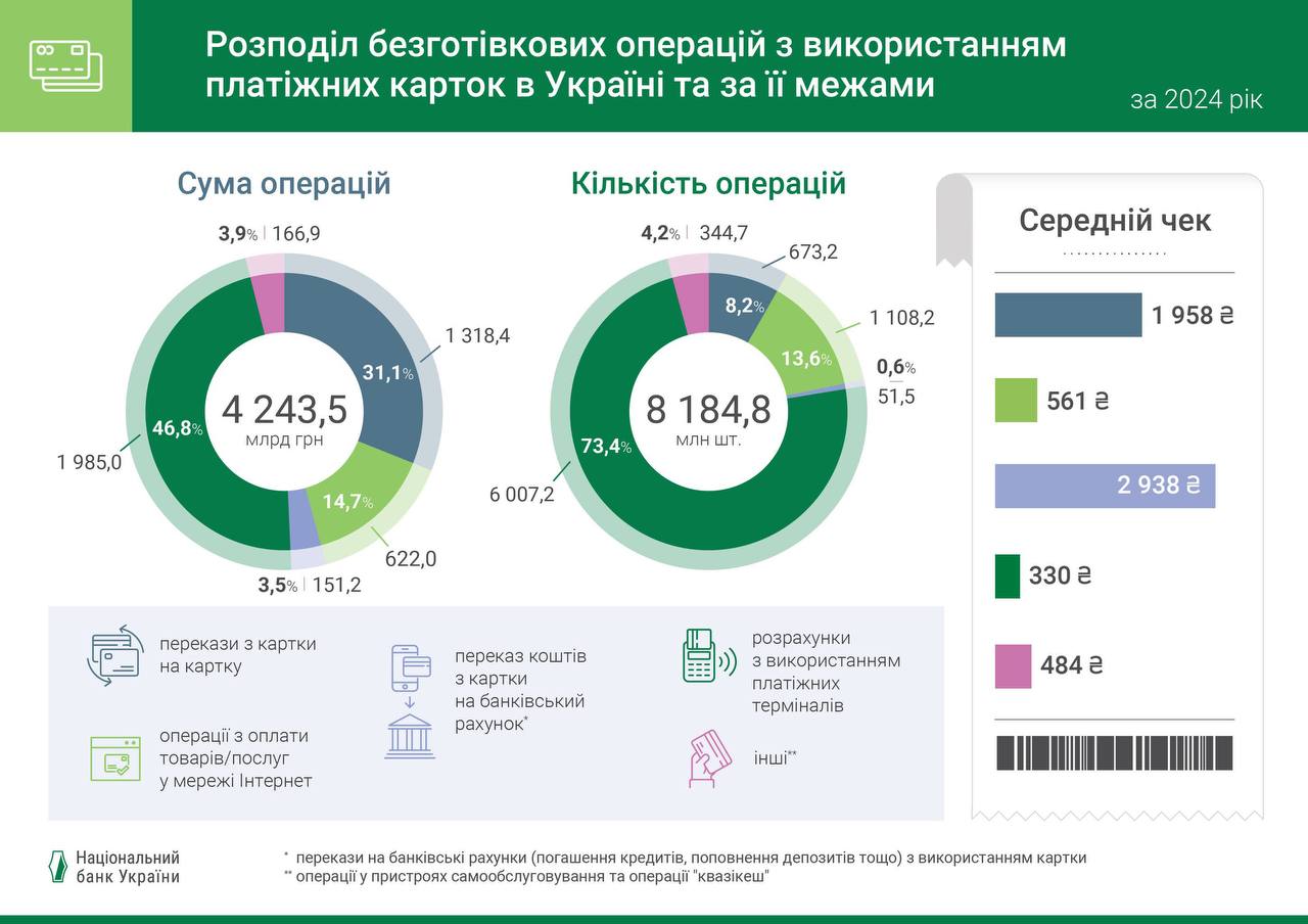 Із загального обсягу у 2024 році безпосередньо в Україні було здійснено 91,8% від кількості та 90,1% від суми всіх операцій з картками.