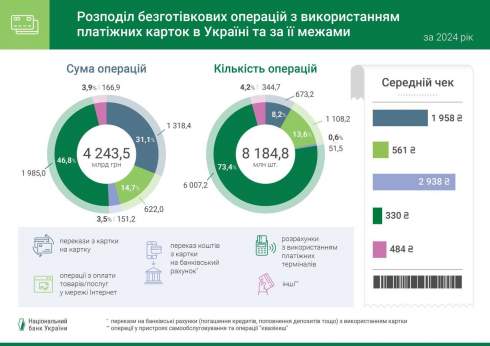 Більшість операцій з платіжними картками в Україні були безготівковими. Так, в Україні та за кордоном здійснено 8 184,8 млн безготівкових операцій на суму 4 243,5 млрд грн. Тож частка безготівкових операцій із використанням платіжних карток за сумою торік становила 64,5% у загальній сумі операцій із платіжними картками. Частка безготівкових операцій за кількістю минулоріч зросла до 94,6%.