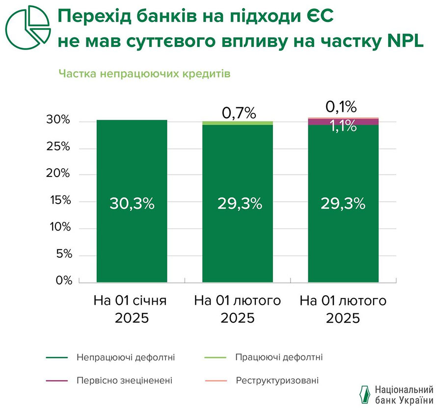 За даними звітності банків, частка непрацюючих активів у банківському секторі України станом на 1 лютого 2025 року становила 30,5%, що на 0,2 відсоткового пункту більше показника станом на 1 січня.
