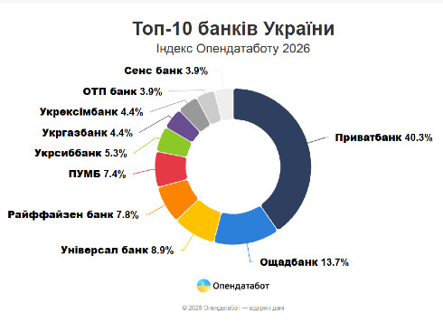 «304,27 млрд грн сукупного доходу отримали торік банки-лідери Індексу Опендатаботу 2026. За рік дохід банків зріс на 14%. 80% сукупного доходу всіх 60 українських банків сформувала десятка лідерів», - йдеться в повідомленні.