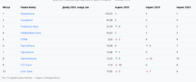 ОТП Банк став одним із небагатьох, кому вдалося покращити позиції у рейтингу. Він піднявся з десятого місця на дев'яте. Його дохід у 2025 році зріс на 7% і склав 11,85 млрд грн, а прибуток збільшився у 1,3 раза - до 8,99 млрд грн.
