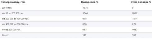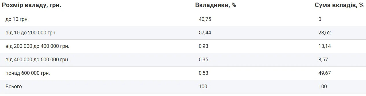 Найбільшу частку (49,7% загальної суми) становлять вклади від 600 000 грн. Проте більшість українців (57,4% від числа вкладників) мають банківські вклади від 10 до 200 000 грн.