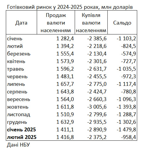 Населення України в лютому 2025 року продало комерційним банкам готівкової та безготівкової валюти на 1,417 млрд доларів (в еквіваленті) і купило на 2,375 млрд доларів. Чиста купівля валюти становила 958 млн доларів.