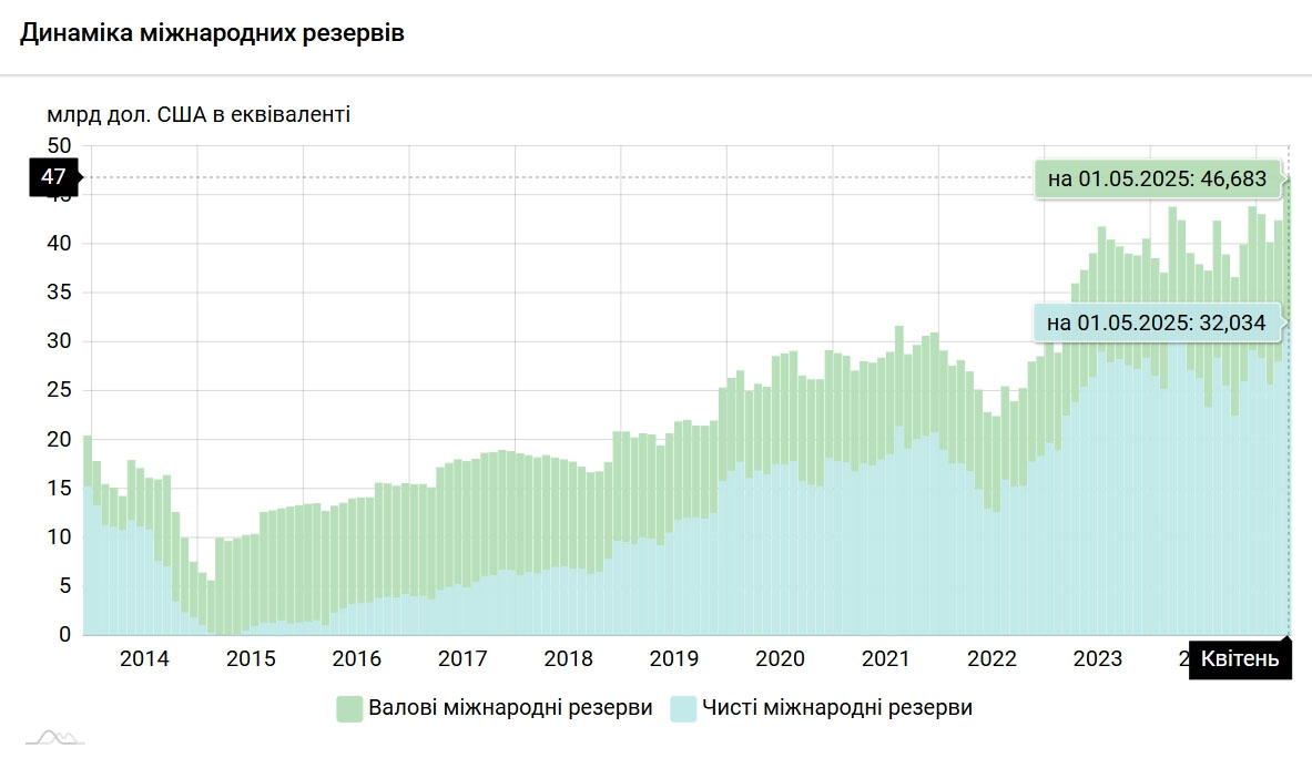 Міжнародні резерви України станом на 1 травня становили $46,68 мільярда.