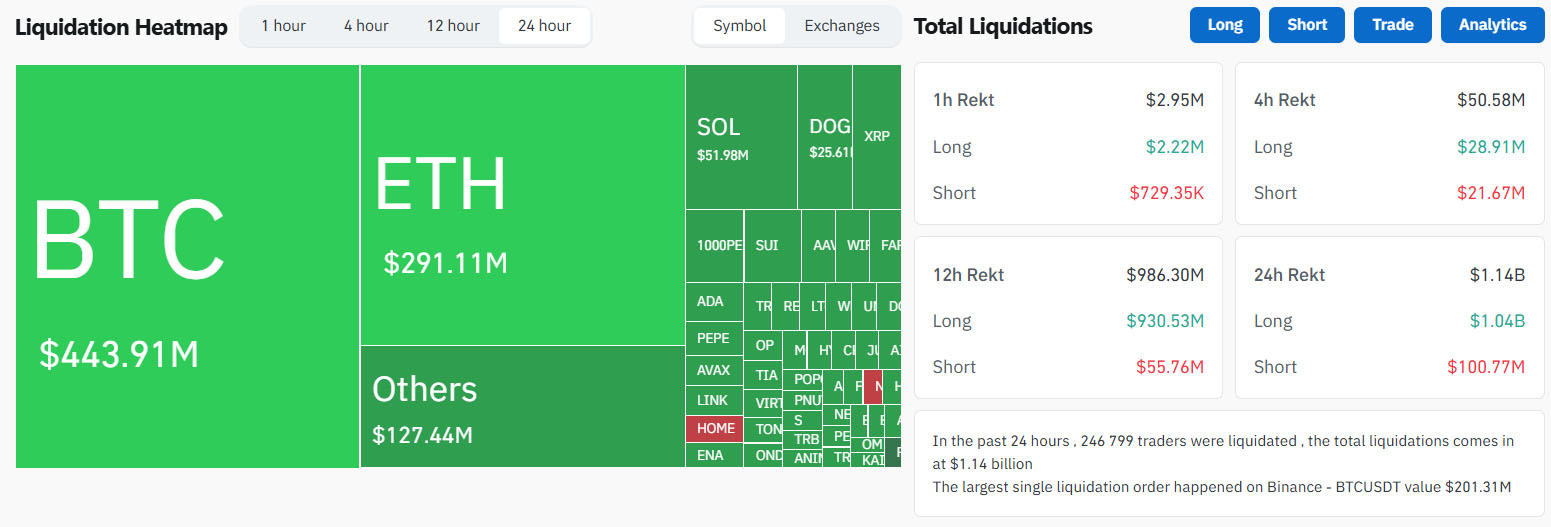 На момент написання добовий обсяг втрат становить $1,14 млрд. За позиціями превалюють довгі, на них припадає понад 91% втрат - $1,04 млрд. За активами домінують біткоїн, Ethereum і Solana.
