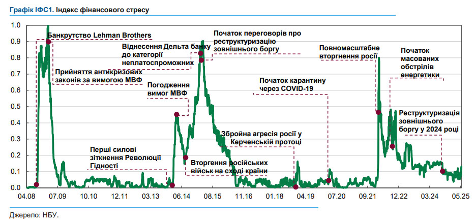 Протягом першої половини 2025 року Індекс фінансового стресу (ІФС), який вимірює НБУ, перебував на найнижчому рівні з початку повномасштабного вторгнення, хоча і був волатильним.