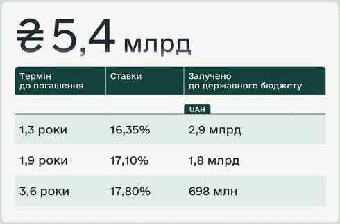 * 2,9 млрд грн під 16,35% з погашенням через 1,3 року,