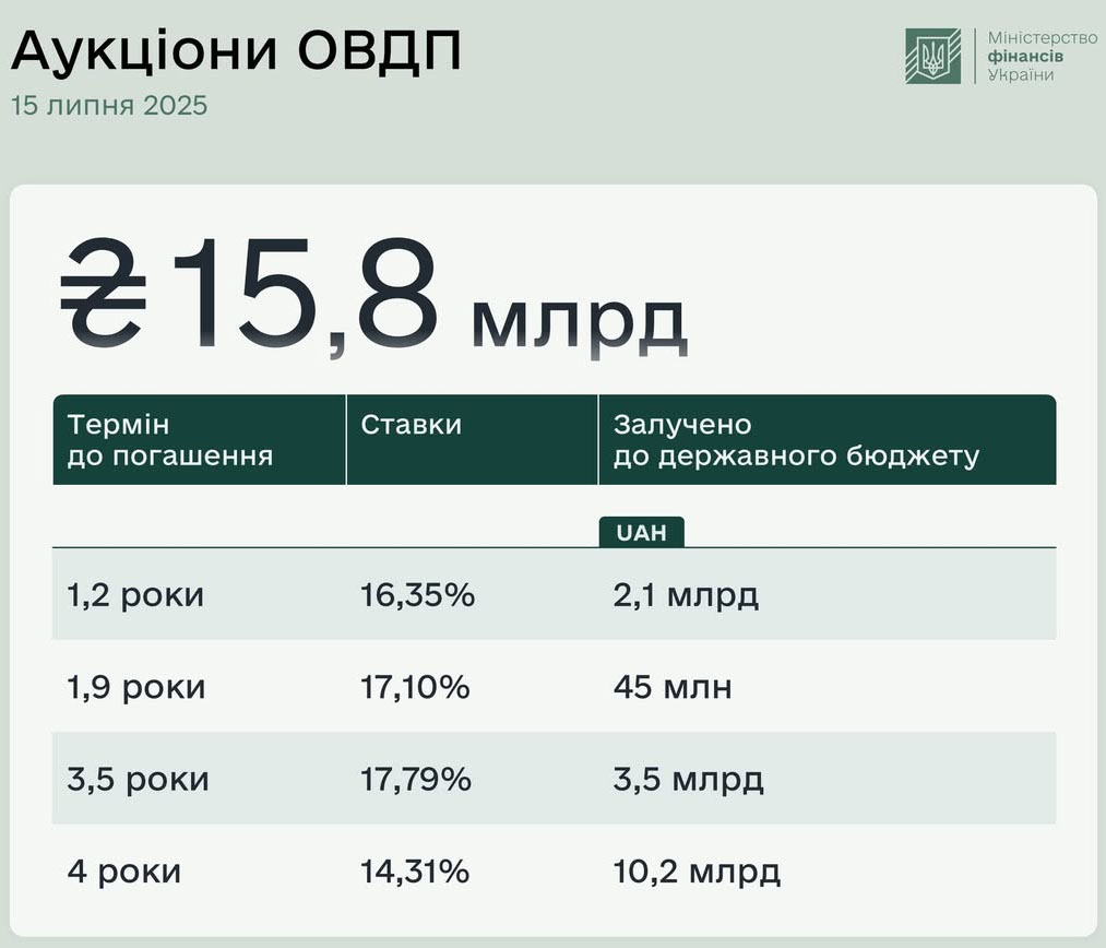 Загалом на чотирьох гривневих аукціонах у цей вівторок Мінфін залучив 15,78 млрд грн порівняно із 8,36 млрд грн у минулий вівторок.