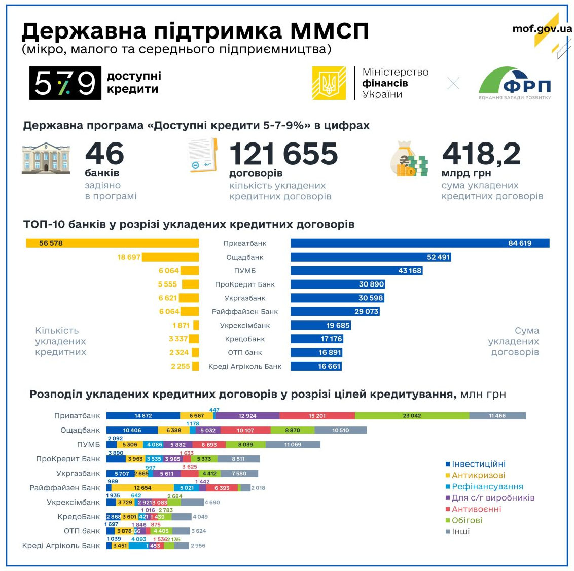 У Мінфіні додали, що від моменту старту програми підписано 121 655 кредитних договорів на 418,2 млрд грн (у держбанках - 84 137 на 193,2 млрд).