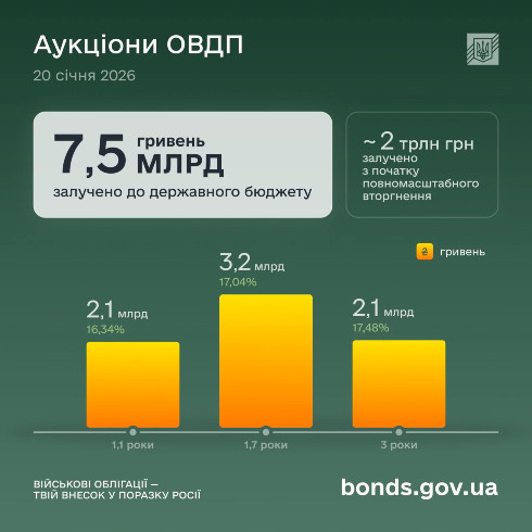 "7,5 млрд грн залучено до державного бюджету сьогодні під час аукціонів із розміщення облігацій внутрішньої державної позики (ОВДП)", - ідеться в повідомленні.