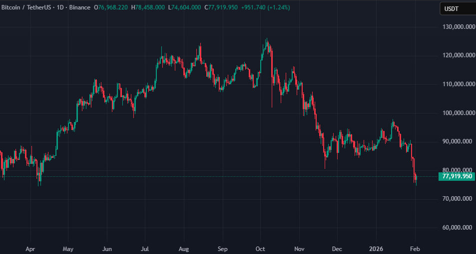 Після короткого провалу нижче $75 000 ціна біткоїна відновилася і зараз торгується поблизу позначки $78 000.