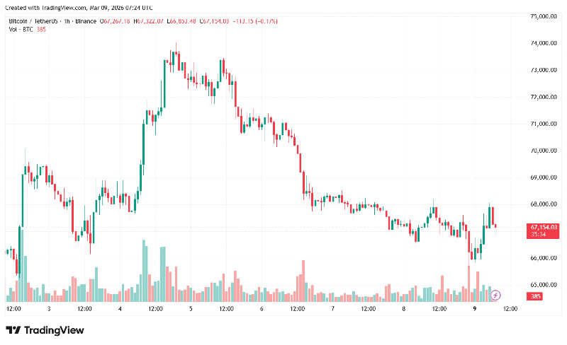 На момент підготовки матеріалу біткоїн торгується по $67 154. Нагадаємо, 4 березня 2026 року актив пробив рівень у $74 000, але не зміг закріпитися на ньому. Відносно цього значення ціна знизилася більш ніж на 9%.