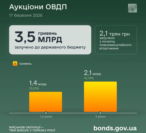 Попит на річні облігації склав 1,8 млрд грн проти 4,95 млрд грн тиждень тому, на трирічні - 6,99 млрд грн проти 17,87 млрд грн два тижні тому. З 33 заявок на короткі ОВДП Мінфін задовільнив 32, а з 25 на більш довгі - 23. Це найменша кількість відхилених заявок з середини січня цього року.