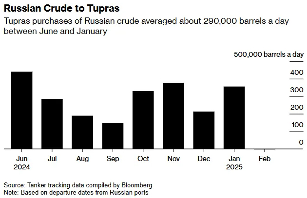З червня до січня закупівлі російської сирої нафти компанією Tupras у середньому становили близько 290 000 барелів на день.