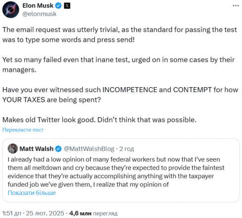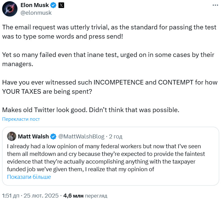 В електронному повідомленні Маска, який очолює Департамент ефективності державного управління (DOGE), була вказівка до кожного з 2,3 мільйона державних службовців США надати підсумок своєї роботи з 5 пунктів до 23:59. EST (04:59 за Гринвічем).