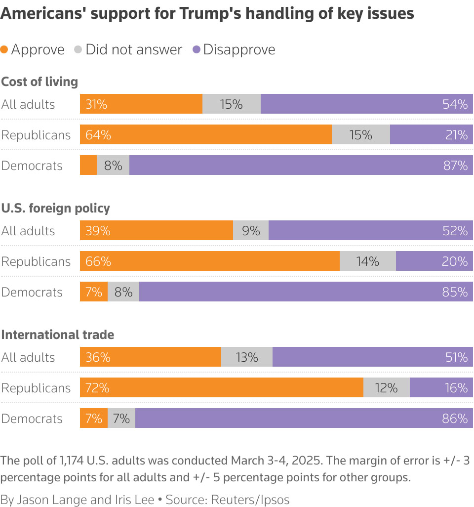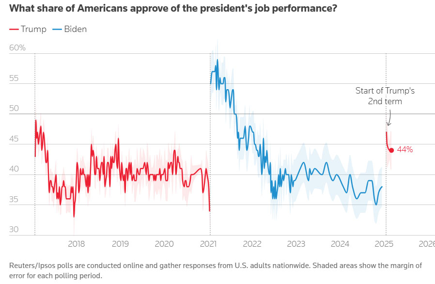 Загалом частка американців, які схвалюють дії Трампа, стабільна на рівні 44%. Однак лише третина американців схвалює його дії щодо зниження вартості життя у США. Це є ознакою занепокоєння через запровадження ним високих мит на імпорт, які посилюють побоювання щодо інфляції.