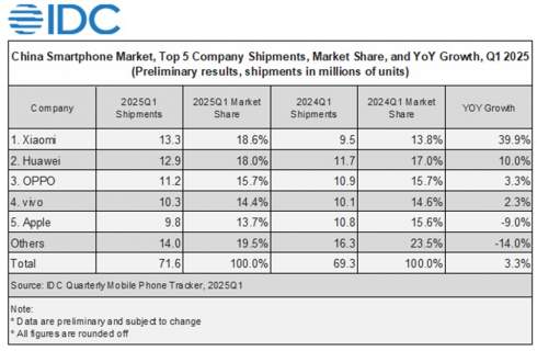 Apple посідає п'яте місце серед найпопулярніших виробників смартфонів та поставила за перший квартал 9,8 млн iPhone. Лідером на китайському ринку зараз є Xiaomi, яка поставила 13,3 млн смартфонів, на 39,9% більше ніж у той же період минулого року.