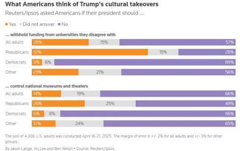 Разом з цим поточна динаміка свідчить, що багатьом американцям "неприємно", що Трамп "намагається покарати університети, які він вважає надто ліберальними, і поставити себе головою правління Центру Кеннеді, великої театральної та культурної установи у Вашингтоні".