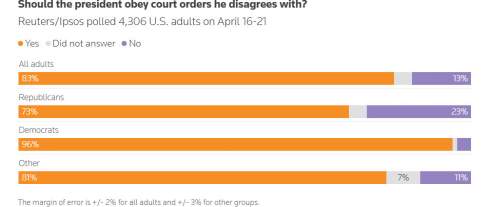 Близько 83% із 4306 респондентів заявили, що президент США повинен виконувати рішення федерального суду, навіть якщо він цього не хоче.
