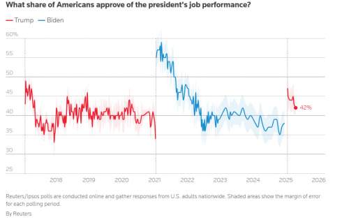 При цьому західне інформагентство звертає увагу, що рейтинг схвалення Трампа залишається вищим, ніж рейтинги, які спостерігалися протягом більшої частини президентства його попередника-демократа (Джо Байдена) за даними опитування Reuters/Ipsos.